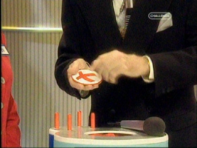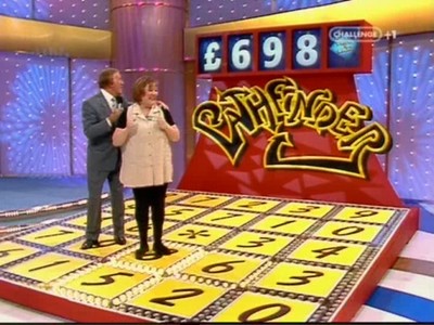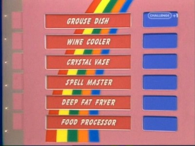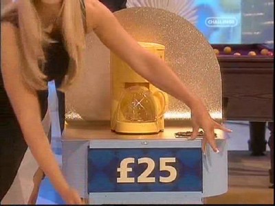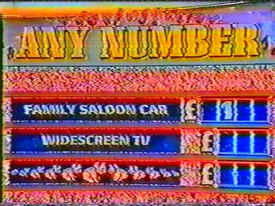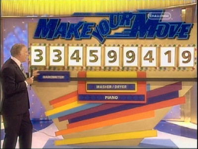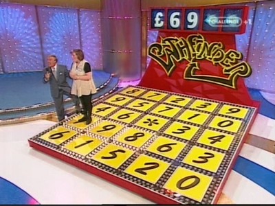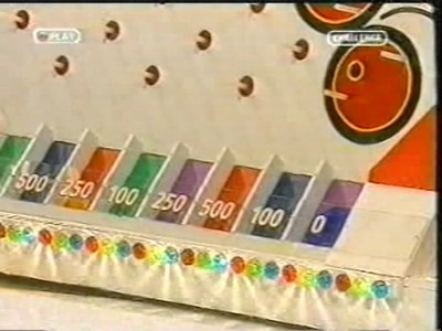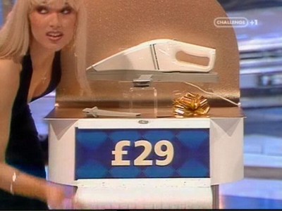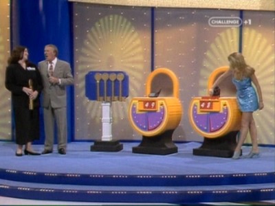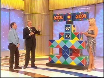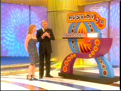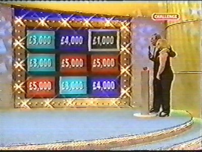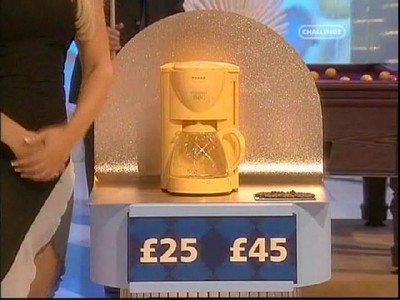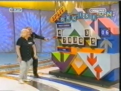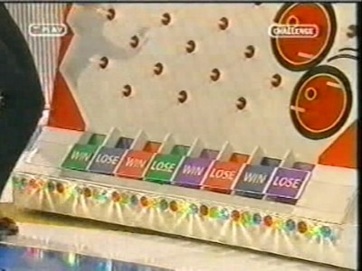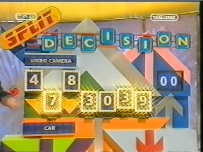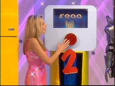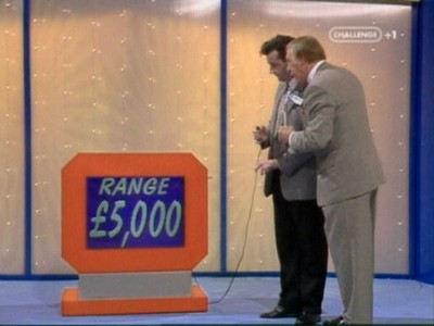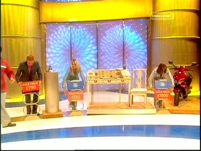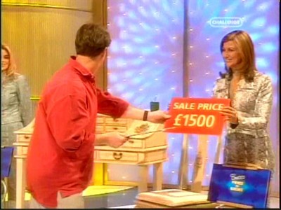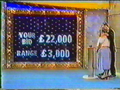 It’s Britain’s Brightest (or Biggest) Game!Nice to see you, to see you…NICE! Your host is the perennial Bruce ForsythBruce’s Spice Girls…er…Price GirlsAnd the Price Boy…yes, a male model on a game showBruce helps this older lady down the stairs as she is called to Come on DownBidder’s row is on stageBruce is beggin Michelle to join him to play a pricing game. She better hurry or else she may not win…a new car!Oh horrors! Pick A Number! For a car!!Is the first digit 6, 7 or 8? This is bloody well impossible!She won! £7,339The stars of our show…whoever you are!What the heck is that? It’s a floating globeYou could win a rock band…or a Lake Tahoe ski holiday!She is going to play Check Out. To win, her total must be within £1 of the actual totalSeems a tad cliche, doesn’t it?Her total is £5.85All of the products aren’t sponsored. Bruce told her at the beginning that the products were “own brand” items (no name)Actual total £5.83!She missed it only 2 pence! That might be closer than even the American show! Wow!Why does Bruce look so surprised? She chose the rock band over the holiday. As they went to commercial, Bruce said “Fancy wanting the rock band!”The next contestant could win three of these 5 prizes! The prizes are a dollhouse, laserdisc player, fridge, dishwasher and a TV with Nintendo64Presenting the giant credit card to play…uh…Credit CardHis credit limit is £2,250He chose the laserdisc player, fridge and dishwasher for the win! These are the prizes that he wins…not all 5There are the prices. He could have won by picking almost any combination of the 5 prizes!Hmm…wonder what part of the show is coming up next?Spin 100 in one spin or a combination of 2 spins and you win £1,000 cash! Show them the moneyOhh! Heartbreak! Misery!The mighty British price is right wheelWhat is it with this show and floating globes? (This is from another episode)Would you like a TV?Or a new car?!Avoid the piggy bank as you play Any Number. Bruce suggested she not shake the piggy bank wearing that dressThe rules here are the same. Notice that instead of a vane display, they use a monitor to display the digitsHe started with 1?One more for the car. Notice, again, that he hasn’t lit up any other numbersBruce can’t believe this guy. He started with 1 and is almost a new car owner!He won! The lucky bugger gets a hug from KimberleyThere are the prices…”There’s the proof” as Bruce saysA skier and a garden swingIn this version of clock game, all prices end in 0 and 5A cool shot of the entire stageLea shows us that the price of the exerciser is £180She’s bidding like crazy but gets flustered as time winds downShe wins! No time left on the clock and the price was £995To win your showcase you must come within a range randomly selected by the Range FinderPush the plunger to stop the numbers from flashing aboutOoh! She got the biggest range possible! £5,000Her showcase begins with binoculars and a cameraWhich she can use on a week long African Safari and week in MombassaThen beautify your bedroom when you get home with this wide array of bedroom furnitureHave your own safari in your coral-coloured Toyota Rav4Her bid is £25,000 and she must come within £5,000 without going overThe Actual Price “pixels” inShe wins! Shes taking home her showcase, rock band and a miniature greenhouseThis lady has a £3,000 rangeHer showcase features this unique aquarium……scuba package……12 hours of diving lessons……a 2 week trip to Sydney/Great Barrier Reef and Cairns……and ends with this 200hp Skiboat!The total can’t be over £25,000Oh dear! She really missed it!The video wall really drives it home. Too bad dear but she did win over £1,600 in prizesWould you like to win a video camera with tripod?How about a 5 door hatchback?! Don’t get too excited, it’s a KIAOut of retirement, and across the pond, is Split Decision!Make sure you press the button to stop the clock after pulling down the digits in the price of the carThis version is plagued with problems too. The clock never seemed to work right and the numbers were “bouncy”No no no. There are 3 digits in the camera price!The audience was screaming £7339 for the car. Bruce even told her what they were saying and to put the 0 upThe audience was right. No car. Too bad.All of these prizes (a fridge/freezer, TV with Nintendo64 and stereo) could be yoursAll he’s gotta do is find the Secret X you get one X free and 3 chances to win 2 more XsPlay along time. How much do you think this nutmeg grinder costs?Did you guess correctly?He couldn’t be in better shape! The only way to lose……is for the X to be at the top. Oh shame audienceThe final item up for bids is a camera which Bruce poses forBrian chokes on the fog as they reveal a sport motorcycle! Also included are leathers, helmet and a 5 day courseYou can win it playing Plinko. Yes, that’s not a mistake. Plinko for a motorcycle. Bruce mentions the Plinko Dish..er..DiscHe got one disc free and wins up to 4 more by pricing small items. Every price shares a common last digit (in this case zeros)Bruce is behind the Plinko board with David and encourages the audience to make some noiseThat’s no good!With his 4 chips, he won £1500!He can risk the £1500 to win the motorcycle if the chip lands in a WIN slot. If it lands in LOSE he wins nothingAgainst the advice of his wife (who is 3 months pregnant) he’s going for it. Emma kissed the disc and now he’s kissing the discEveryone felt bad for him for losing. However, he wound up winning a showcase worth over £28,000This lady is going to play (1 2) 3 StrikesBruce shows her an X. If she draws 3 Xs, the game is overA nice close up of the board. In the UK, baseball is called ’rounders’ and doesn’t enjoy the popularity it does in the US so the board isn’t given a baseball motifShe reaches into the cannister…Is the first digit 3?Looks like she won without drawing a single strike! Well played 
