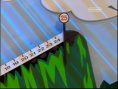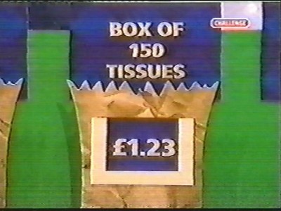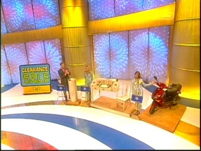 Bruce ushers her into position for the big revealShe wins!“What am I going to do with a motorcycle?!”Bruce gets a hug…I don’t think he minds at allI think the woman in blue (bottom left) thinks she is going to get a ride on the motorcycleThis wide shot of the studio shows the next contestant is going to play Clearance SaleThe first prize is a camcorderNext is a writing desk and chairThird is a motorized scooterBruce shows the young man all of the sales pricesPut a sale price on each prize and win all 3. A nice close-up shot of the tagsBPiR had many of these long, sweeping shots of the entire set like this. Behind the young man, you can see the showcase areaHe puts £1,500 on the scooter£950 for the deskThe prizes are lined up on stage. Even on BPiR the contestant doesn’t know where to put the sale tags!Ooh! The camera is £1,350. £750 is a sale price but it’s awfully low…ExactlyArgh! Should have reversed the first two tags. £750 belonged on the deskAnd there’s the proof the he had the scooter rightFor this series of BPiR Plinko gets a paint job. I don’t think Bruce had to get Maaco.By this point in the shows run, Pearson is a co-producer in nameAnd here, Pearson is merely a subsidiary of Grundy (and later Fremantle)Later, in Let ‘Em Roll’s history, they ditched the grocery items and switched to a On The Nose scoring system. Can you pick the exact price from the 3?The player did and won 3 rolls