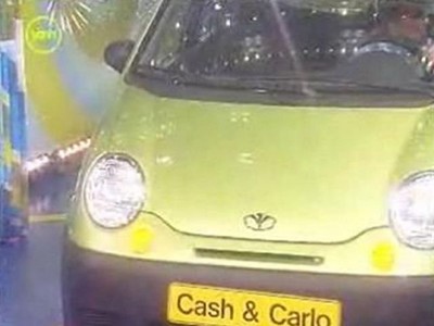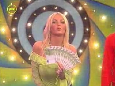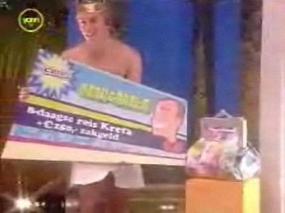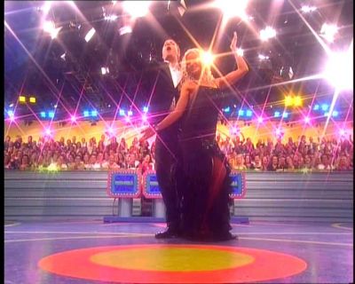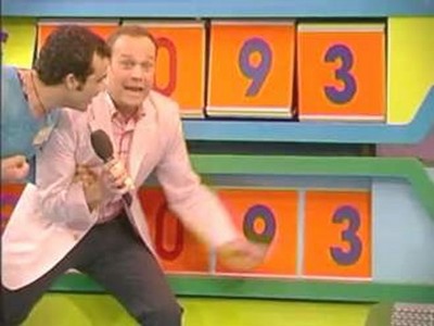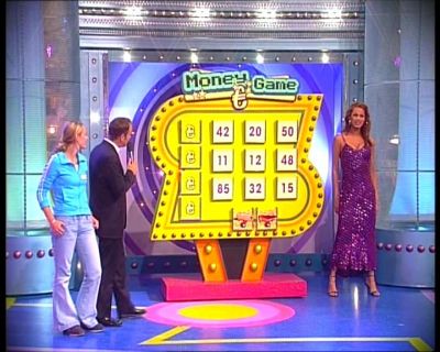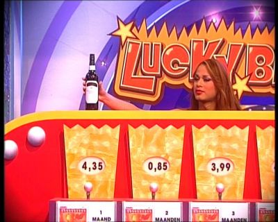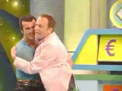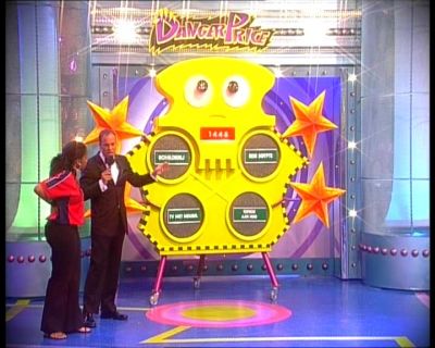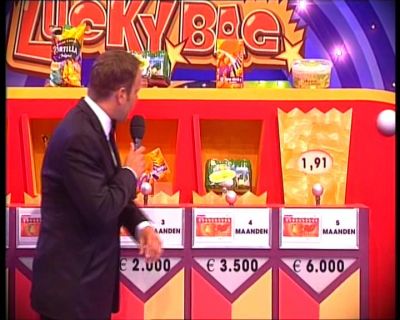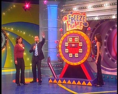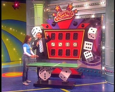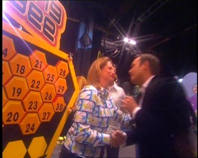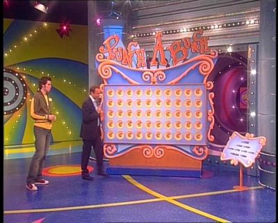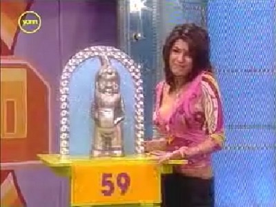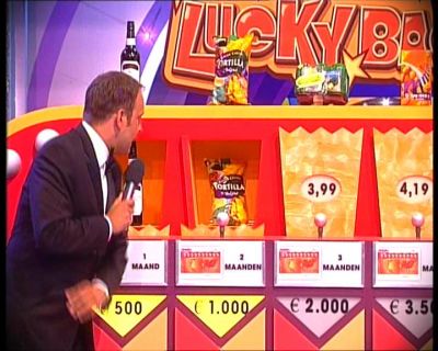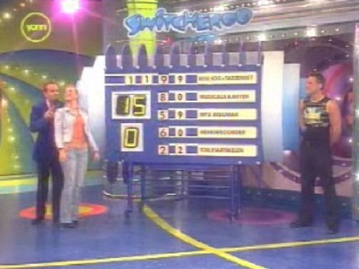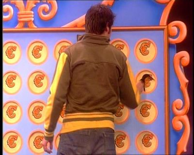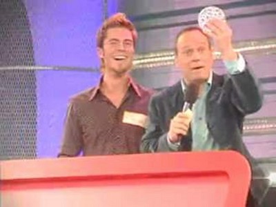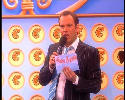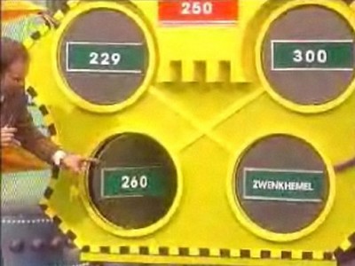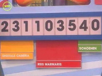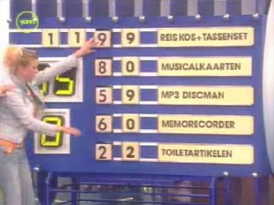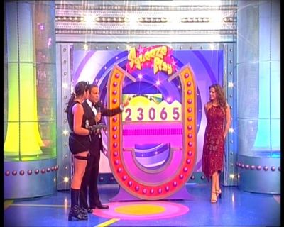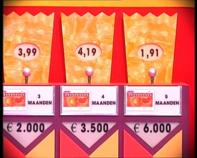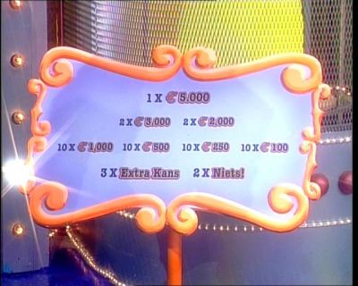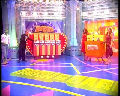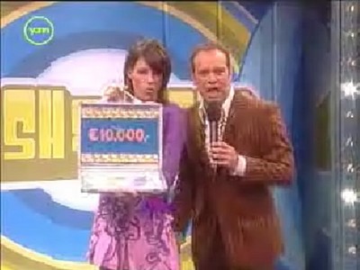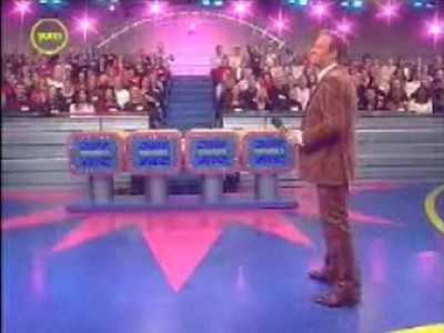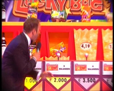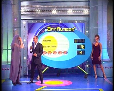 Cash En Carlo is on in The Netherlands on the Yorin network. They have a catch phrase where players are told “Yorin (you’re in) the Game!” This gallery wouldn’t be possible without the generosity of g-r.net user PatchyThe host is Carlo Boszhard. Here he asks for the first four contestantsCarlo does a series of dances as each person is called on down, hamming it up for the cameraThe first four are ready to bid on……a lovely coffee maker! All of the IUFBs are small prizes like thisThey’ve all over bid on the coffee maker. The bids are erased and they try againThe price is €18Ossman is the winner and he gets to playDanger Price (sponsored, apparently, by Spongebob Squarepants)He’s playing for a digital camera, a pair of small kitchen appliances, a lamp and an upright tanning bedThe danger price is €250. Pick the three that don’t cost €250 and he wins all 4He wins! The tanning thing was €250The next contestant could win a scooterSara Ann, from the UK and who has never heard of Bruce Forsyth, plays CliffhangerHow well does she guess at the price of this photo album?She missed it only €1! Malcolm is safe…for nowOver he goes! She guessed €25……on this €59 aluminum garden gnome. She missed it €34The last game is for a trip to Crete and €250 spending moneyThe name of the game is Hurry Up (Bonkers)Carlo demonstrates how the discs work. She only has 30 seconds to get them in the right spotsShe has to run across the stage to hit the plungerAnd she didn’t win. The evil price was €1,128Get 100 on the big wheel and you win €1,000!But if you get 100 in the bonus, you win €10,000!!She’s ready to spinAnd gives it a mighty twist!She eventually scores 35 which isn’t enough to stay in the gameAnother snazzy graphic with dancing people as we go to the showcaseSara Ann stands at the plunger looking at the tiniest video screen ever. I’ll be generous and say it’s a 42″ widescreenThe amounts flash around ranging from €500 to €2,500Sara Ann gets ready to hit the plunger and gets…A range of €1,250! That means she can miss the price by as much as €1,250 without going overIn her showcase is a sport jacket, wake board and lessons for 10 people, a man’s watch and a trip to Cuba!Sara Ann prepares to give her bid on the array of prizesThe range is €1,250Her bid is €3,500Actual price is €4,714 for a difference of €1,214 she wins!!The models celebrate with Sara Ann. Cash en Carlo is co-produced by Endemol. Yup, that’s the same company behind Fear Factor, Big Brother, Changing Rooms and other reality showsAt the start of the 200th episode of Cash en Carlo……Carlo leads us backstage past many of the pricing game props. In the first one, you can see 10 Chances and Hi Lo. In this one you can see Pushover, 10 Chances, Plinko and SwitchCarlo walks past Any NumberAnd points at the sign atop Hurry UpThere’s JokerAnd here is a close-up of the Money Game board and it’s holographic/shiny cardsDanger Price and Cliffhanger is in the background as Carlo now walks past the crew who make Cash en Carlo possibleMore crew in front of 3 StrikesThis lady gets a kiss by the Spelling Bee boardThese crew members are excited to play Let Em Roll (Switcheroo is in the background)Carlo walks past Make Your MoveCarlo goes to take his place……for his grand entrance for the 200th timeConfetti and sparklers aboundCarlo heads to centre stage for the mic and a dance with the model. However, before we start the game, Carlo…you have a special message from……The Price is Right, Bob Barker! Bob congratulates Carlo, the show, the staff, the station and the viewers!Carlo looks shocked!Bob wants to say it just right has enlisted Stan Blits (who doesn’t speak a word of English) to helpStan has been on the show 25 years and has never learned English.Carlo is doing his best impression of the cat that ate the birdStan delivers a message to Carlo, in DutchBob says he couldn’t have said it better himself.Finally, together, they say “Congratulations Carlo!”Carlo looks like he might start crying. But there’s a show to do!A cleaner shot of Spelling BeeA nice clear shot of 3 StrikesA new Daewoo is being rolled out to playLet ‘Em Roll! Carlo explains that you need 5 cars in 3 rolls to winIt’s Make Your Move with the same rules as every other versionHe has the digital camera at €231, shoes at €40 and a trip to Marmaris (a resort city on the Mediterranean coast of Turkey) at €1035The young lady is playing 3 Strikes. Again, like most other countries, baseball isn’t popular so they lost the themeAnd she won without drawing a strike! Well played!Cash en Carlo only has one commercial break and this is one of the bumpers. Carlo and his friends playing leap frog30 seconds are on the clock for Switcheroo where she can win a trip to the Greek island of Kos (plus teacups), tickets to a musical, MP3 player, voice recorder and a toiletry kitThe young lady furiously moves the blocks around15 seconds are left on the clock. How many does she have right?2 are right and she decides to make some changesShe ended up changing only 2 numbers and won the toiletry kitThis young man can win……well…we don’t know. The doors opened on a Marilyn Monroe and Elvis impersonator. Perhaps a trip to America?His game is Secret X which is played just like the US versionWinning only 1 X, the only way to win is for the X to be in the middleWow! Even Carlo can’t believe he pulled out a win!Spelling Bee is the game and it’s even played for a new car! A Daewoo.Carlo points out the distribution chart. You have to spell WIN and there are even 4 cards worth a bonus €1.000!Each card is worth €200. He gets 2 free and wins up to 3 moreHe won only 1 more card and found 2 ‘I’s. Not a winner.When Cash en Carlo first started, this was the original logoContestants Row looks pretty much the same with a slightly different color schemeThe first generation set used curtains instead of doors and w