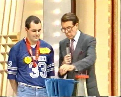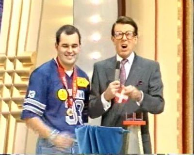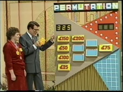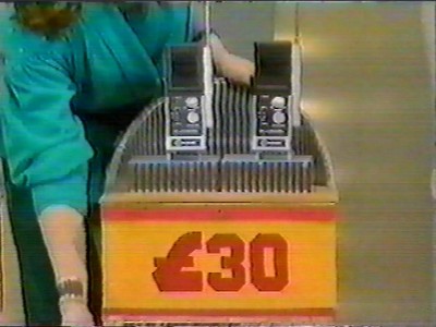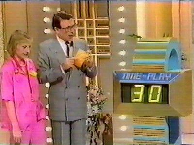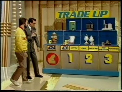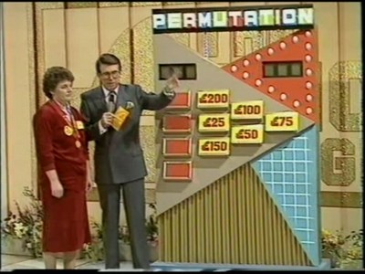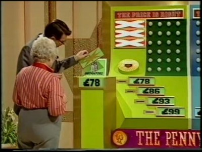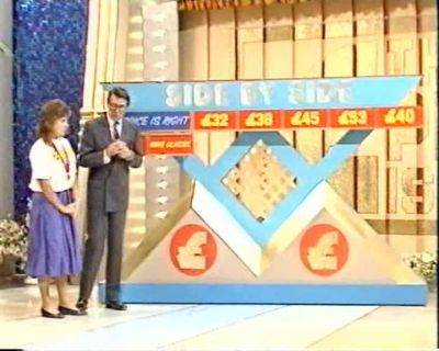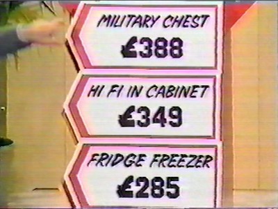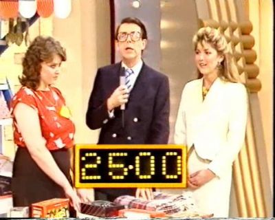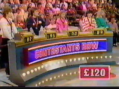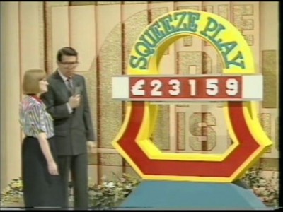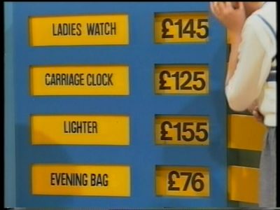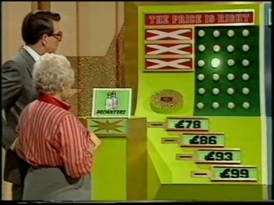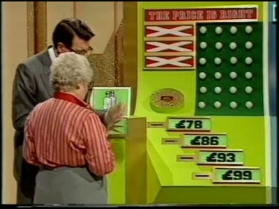 From the very first episode of The Price is Right in the UK, the audience is in a frenzyHere’s your host…Leslie Crowther!The first pricing game is Race Game. Same rules as in the US.The big curtain opens and the models wheel out the 4 prizes.This lady rushes about, giving the price tags to the models2 right, 2 wrong. One correct change for the win with plenty of time on the clockOops! Wrong way…and only 4 seconds left on the clock!She rushes to make just one more changeTime has expired and she’s won 2 of the 4 prizesThe barbecue is hers at £78As is the washer at £150!She seems very excited, having won a washing machineThis is a “timer” meant to tell the local channels when to start the tape for the 2nd half of the showThis lady is playing Take Two. She must pick two prizes whose prices add up to £300. Those prizes are……a bunch of stuff. The prize package includes a watch, clock, lighter and evening bag.The clock is £125. Is something there £175?Well, it isn’t the watch.Leslie explains to her that she can keep one of those and pick another or take the other two prizes. She opts to keep the watch and take the lighterWinner!And there’s a reveal of all of the pricesWilliam G. Stewart stayed through all 100 episodes of Leslie’s Price is RightMr Goodson gets a plug at the endLeslie and your winner for the night! (she played Race Game)The ident logo at the end of the showIn the early days of TPiR, they had a big wheel. No pointer though…the space “in play” was lit up from inside. This woman just hit the 100 and Leslie is explaining how the bonus spin works.On Leslie’s show, spinning 100 (one one or two spins) netted you £500. In the bonus spin if got 5 or 15 they won an £250 more. But if they landed on the 100 again they got £1000 for £1500 in total! That’s a LOT of money for the early 80s.The wheel was “hidden” in a wall ala the German version.In late 1988, they changed the opening spiel and titlesCouldn’t they have found words that rhymed with “right”?This would be followed by the logo “The Price is Right!”Can you guess the game here?A light comes onShe guessed the price of the decanters wrong and she gets another choiceAnother lightWrong again. Have you figured the game out yet?She lost. Did you figure out it’s their version of Penny Ante called “The Penny Drops”?The right price was £78. Notice how two were only £6 apart?This game is a little like Add Em Up. She’s shown a prize and £150 goes into the bankYou then have to add 3 more amounts to get the bank to equal the value of the prizeLooks like this woman is about to smack Leslie for getting fresh!It’s Pick A Pair! Pick a pair of prizes that have the same price and you win those prizesHmm…it isn’t the toaster and lampThe Race Game setup looks like the Aussie version (about 10 years earlier)These 4 prizes (a picnic basket, Mickey Mouse phone, oven and coffee maker) are wheeled out for……the first incarnation of Race Game. It uses the same clock as The Clock Game. It is very much like the US version. 45 seconds and you can see the handle on the right-hand side of the clock.Leslie shows off the run down of the pricesNo stands in this game, the models hold the price tagsThe only thing to note here is the Big Wheel sticking out of the wallShe only had 1 right but there is plenty of time on the clockAfter the first series, the TV commissions said the wheel was too much a game of chance so they replaced the wheel with Supermarket.The contestants had 15 seconds to select 4 of 6 grocery products. The one who picked 4 whose total was closest to £20 (over or under) advanced to the showcase.The model is there to escort this contestant away after Leslie announced she had spent £25It’s 5 digit Squeeze Play!She’s playing for a jewelry box and a TVDoes she think the price is £3,159? Nope.She still has to remove another digit to make a 3 digit priceDo we have another winner?You wanna believe it!The show was taped in the Anglia region of the UKHere we see the game board for 3 in a row. This is not played like Secret X. Behind each number is a questions that is about one of……these nine prizes. To earn a square, she has to answer correctlyAnother winner!The logo of the first ever version of TPiR in the UKThis was a weekly version airing on SaturdaysThis particular show is the 5th (and final) series premiere in 1988There were 5 models who were introduced at the top of the showHere he is..Leslie Crowther!The first item up for bids tonight is a set of Mahogany library stepsThose steps are £120! Peter wins them with his £95 bidHe could win a hair dryer, clock radio with tape deck, fondue set and a pair of mugs……and a moped!His game is Switcheroo. Notice that the moped is only about 3 times as much as his one-bid prize!Are you happy? 10 seconds left out of 30Three are right. He has another 30 seconds to make any changes if he wants. Leslie gives him the time anywayHe made changes getting only 2 right. They reveal the prices (starting from the bottom) by sliding the name card. He’s won the moped and fondue set!It’s Cliffhanger!Ann, you don’t want the mountain climber……to go beyond this point “into the abyss below”Keep him safe and you win patio furnitureGood heavens! She missed the first prize by £16He’s gone over!! If you thought Hans’ crashing was scary, this mountain climber screams as he falls!There is an announcer but it’s Leslie’s job to call the contestants to Come On DownJohn and Leslie check the envelope to see if his £100 is there for making a perfect bidJohn could win either a stereo system, refrigerator or a “military chest”Most Expensive. More like Easy As 123! He has to order the items from least expensive to most expensiveHe has them in order. If he’s right, he wins only the most expensive prize of the lotJohn wins the chest of drawers!Leslie invites us to come back and see who the next 3 winners will be. The showcase showdown hap