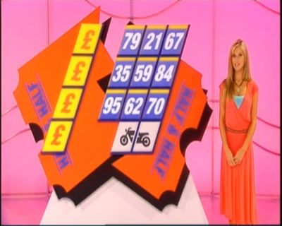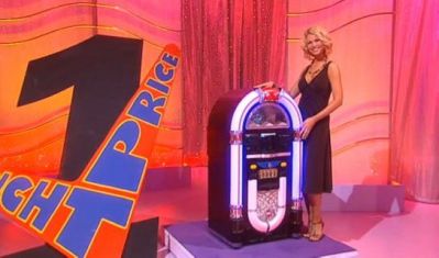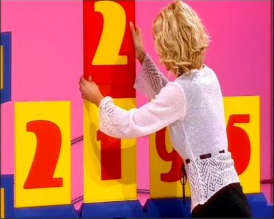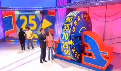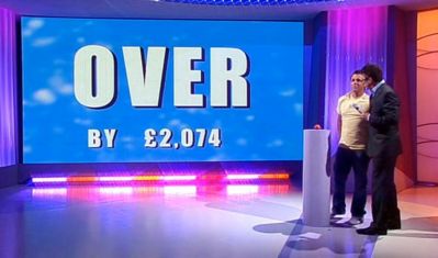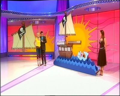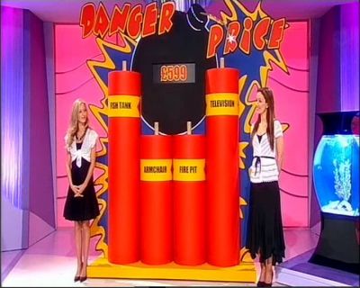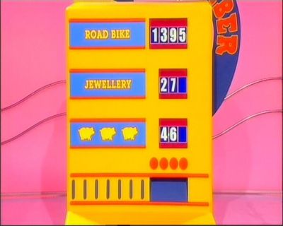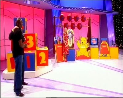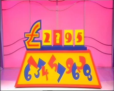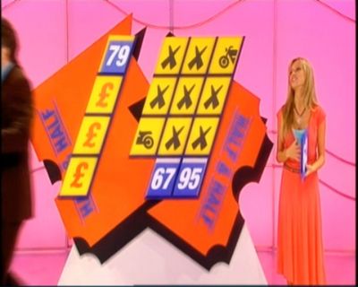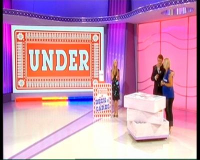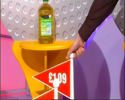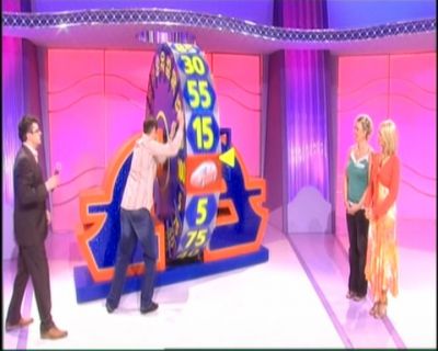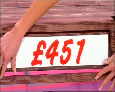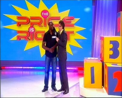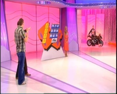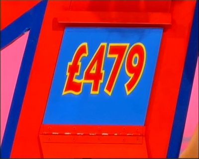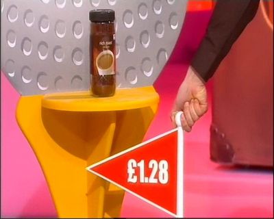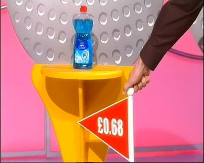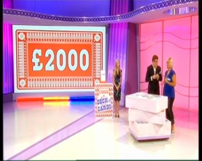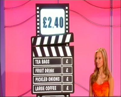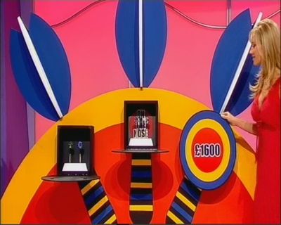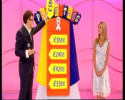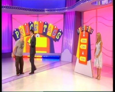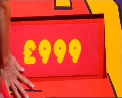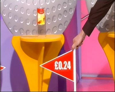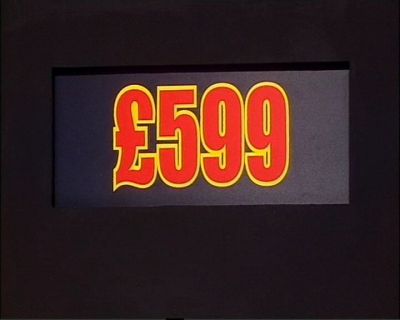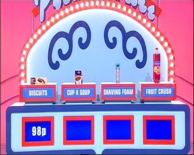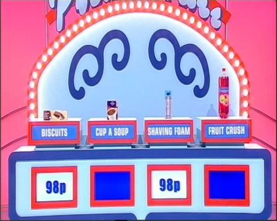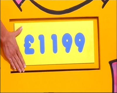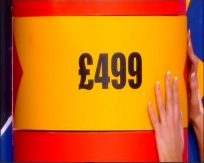 TPiR is back in the UK with a club-like atmosphere and themeAs announcer Peter Dickson reads the opening spiel, the words pop up……and bounce on the screen. This screen will say “You’ll Love It”The Fun……Starts Here!I can’t what?Ah! Resistance is futile. After this “slide” the show logo comes on-screenA large Come On Down sign hangs in the rafters as a thrown back to the Crowther editionOur first 4 lucky punters are in contestant’s rowWe can’t have a show without Joe! It’s comedian Joe PasqualeThe first IUFB is some jewelry. Oddly, Joe hints that it costs more than £200The bids are locked inThe young lad won those and stands beside Joe. Behind them is a massive video screenHe’s playing 1 Right Price for a jukeboxIn this version, he must choose between 3 prices£1,475, in the middle, was right! The first-ever winnerThis model spitfire is next for bids. Joe makes a joke about that “talking piece”Shaz won and now she could also take home…A SeaDoo worth more than £7,000!Plinko is the gameJoe gives her one free disc and now…play along time! Is the foot spa £12 or £22?Were you right? She wasn’t.Here you see the money amounts along the bottom of the Plinko boardPlinky Chinese music accompanies the discs as they bounce down the board£0! She needs to win some money if she wants a go at the SeaDoo£100! That is the extent of her winnings from 3 Plinko discs. She will risk that “huge” sum of money to try for the SeaDooJoe’s “twin brother Reynard” brings out the Golden Plinko Disc of DesireThe old discs will be removed after the WIN – LOSE card is put in placeOh, it got stuck! Joe kicked the board from behind to get it moving againShe wins!Each episode is accompanied by a text game where home viewers bid on an item (in this case a bread maker). A random selection from the correct guessers wins £1,000The series is sponsored by supermarket chain ASDAOur 3rd pricing game of the day is SwapThe first prize is a bar shaped like a coach2nd is a “man” that dries shirts by blowing warm air from the inside…no need to iron either!She left the prices and won!In this version, she only gets to keep one prizeShe’s excited to have won! She took the bar, by the wayThe 3 players are ready to spin the wheel. Notice how they’re ordered from least to biggest winnerSpinning 100 on the wheel gives that person a chance at winning a new car!As the wheel spins, you can also see it spinning on the giant video screen95 is a great score…but not when it puts you over!The jukebox winner watches as the amounts flash around. This showcase is the same as Bruce’s versionPressing the plunger stops the flashing ’round£2,000. Not bad. That means he can miss the price of this showcase by under £2,000 but he can’t be one penny overHis first prize is a GPSThen some dining room furnitureA trip to IcelandAnd finally a street-legal off-road buggyHis bid is £12,000 and he can’t miss by more than £2,000Oh!He was over and no more prizes for himJoe and the models commiserate with the loser One credit slideMore credits with the models and announcerYe Olde Fremantle Art CardDid I mention the show is sponsored by ASDA?This time, we’re playing for a shower unitTake 2 is the game. Note the cool Hollywood-themed setAgain, I ask you, a little stereotypical, no?Blech! Pickled Onions!Same rules as USPiR. Which 2 products total £2.40?Starting with the tea bags which seem like a good choiceWhoops! The Fruit Drink won’t work!Joe and the lady consider her optionsShe took the pickled onions for the win!Way-hey! Well played ma’amWould you like to win some lovely jewelry?What about this off-road motorcycle instead?The game is Any Number3 digits placed. Avoid the piggy bank because it’s in pounds and pence!Another winner!A motorbike. Hurrah!This time, it’s One Wrong Price for some kitchen appliancesDo we have another winner?Yup! Another perfect show!A moped is up on offerPick A Pair is the game. It’s very closely modeled after the American set-upOnly 4 items though. The biscuits are the first pick at 98p. Can you find the match?Right on the first pick!‘Raynard’ is back as a real-life mountain climberIt’s Cliffhanger with no changes to setup or game-playLet’s play Joe’s Bargain Bar for a rocking horse priced at £425 and a fountain at £351Actual price of the fountain is £451For a bargain of £100Actual price of the horse is £625That’s a £200 differenceAnother winner!That’s a tough Pick A Number setup!Colorful thoughYou are *NOT* a winnerCheck out that snazzy Danger Price set-up. We’re playing for a fish tank, chair, fireplace and TVCan she avoid the danger price of £599?The names on the dynamite sticks turn around to reveal the prices£499 is the price of the televisionIn the next pricing game, they contestant could win a trip to PragueIf he were alive, Johnny Cash would love this game…Walk The Line. The object of this game is to guess if the price of the next item is higher or lower than the current oneThe water is 29p. Is the soap higher in price or lower?It was higher and the tuna even higher still!The biscuits are lower than the tuna in priceIt’s Safecrackers…with a real safe!Joe opens the safe to revealJewelry. The price of the jewelry is the combination of the safeShe set the dials to £495A green light means she won!Another satisfied customerThe next pair of prizes are these go-kartsThat’s a snazzy Hi Lo set. The rules are exactly the same as in the USEven the price cards are fancyI see blocks marked 1, 2 and 3Which means he is playing Easy as 1 2 3The prizes are a CD jukebox, TV and a pair of phonesThe CD jukebox is £729The phones are £999If the TV is more, he’ll win the lot£1199! Winner!Who wants to win a plasma TV?Pushover! With a pirate theme! Arrrgh matey!As the numbers “walk the plank’, they are eaten by the fishShe settles for £895She’s a winner!This time, the prize is a fabulous Las Vegas holidayElvis lives!!The game is