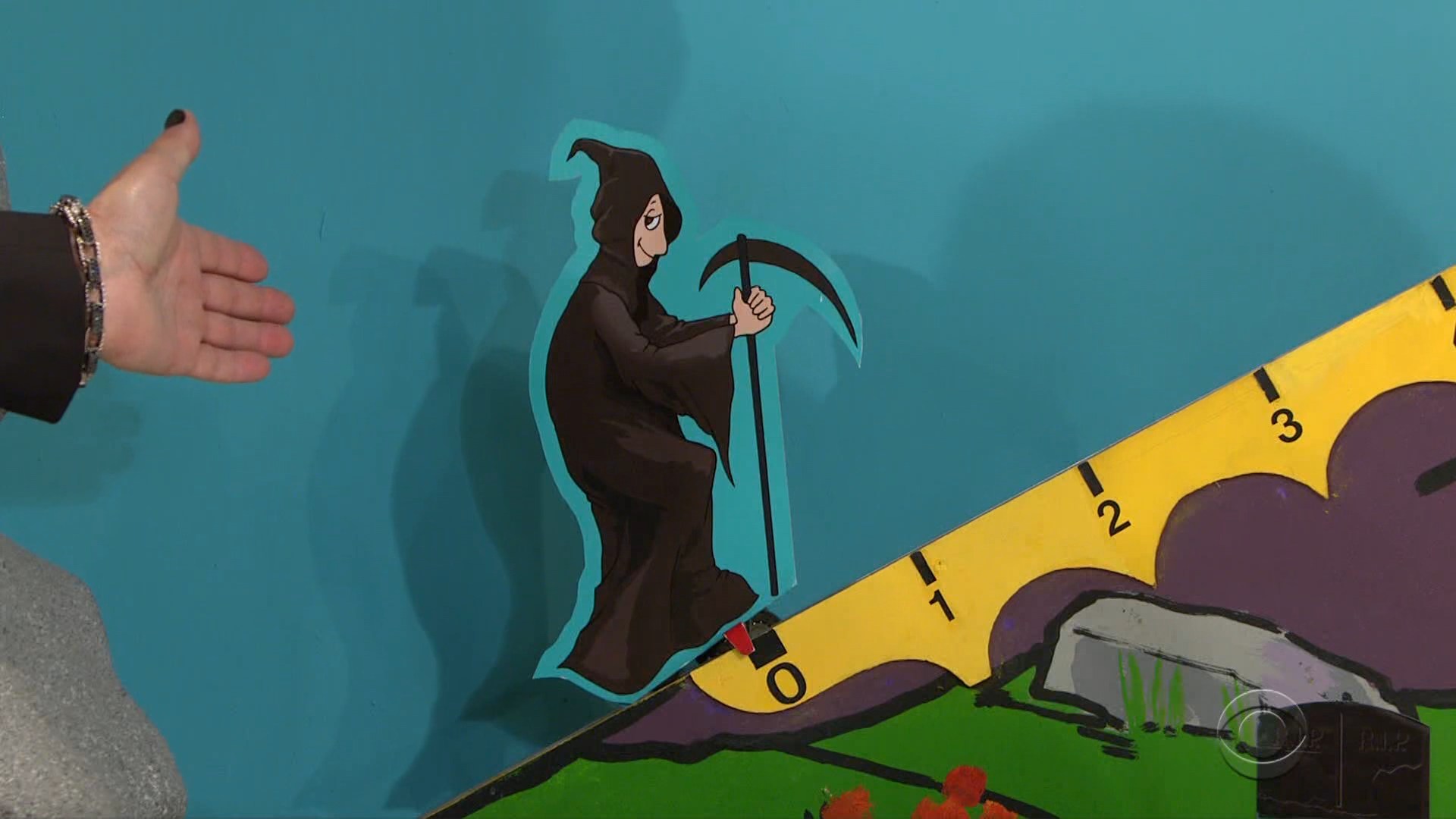 Gerie’s next bid is $13 on this can opener shaped like a soup can. Again, the mountain climber’s perilous journey recommences…