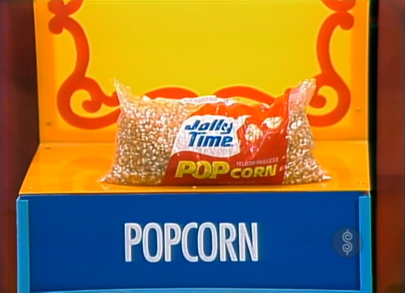 Mary chooses the popcorn. After waiting for it to come around the wheel, it is revealed to be 99 cents.